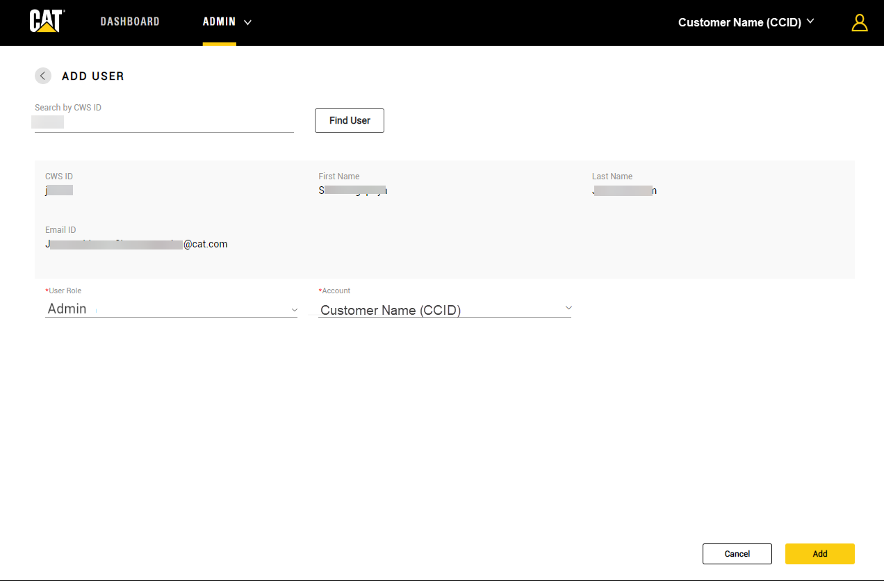 New users must have a CWS ID linked to CCID to be added. Contact your dealer for further assistance.