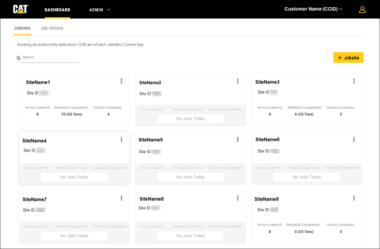 A Jobsite is an area directly or indirectly owned, operated or controlled by customers where machines perform certain tasks to achieve a goal. The Jobsites tab under Dashboard displays a summary of all such jobsites created under the logged in customer account, each represented as individual cards. It is the default landing page when user logs into the Dispatch for Loading application and the data is displayed here is based on pre-selected Preferences.