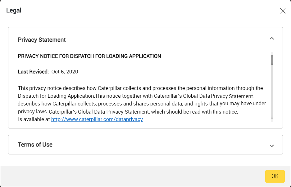The Links in Footer option comprises of copyright information and footer links such as Contact Us and Legal of Dispatch for Loading application.